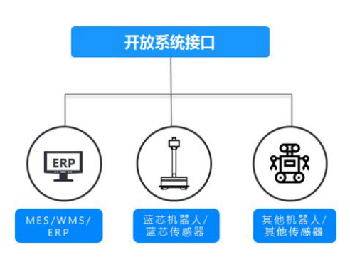 不光是蓝芯机器人通过开放协议接入,也有其他厂家的机器人。对接已有的ERP/MES/PDM和WMS系统。多机种接入和协同管理,多业务系统对接,帮助组建企业物联网平台。