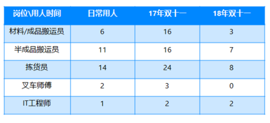 2个月短时间内,招聘60人。这还不包括招聘和管理成本。隐形增加的临时成本和耗费精力可能更多。2018年中,我们向老板推荐了我们的调度系统和相应的机器人,配置是一套iRCS,5台搬运机器人,2台无人叉车和5个固定3D视觉抓取设备。8月开始导入,到9月就已经稳定运行,人员配置相比平时: